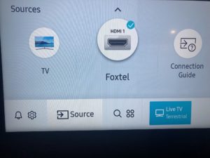 Turn on TV with remote and then select ‘source’ button. There you will have a choice between TV or Foxtel.